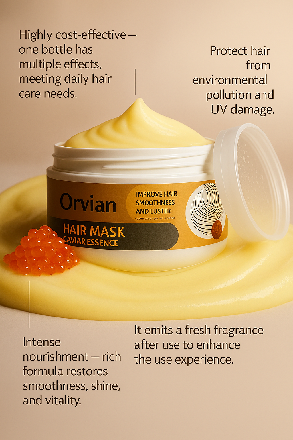 Indulge your hair with luxury care. The Orvian Air® Caviar Hair Mask is enriched with caviar extract and natural proteins that deeply repair, hydrate, and restore shine. Perfect for dry, damaged, or color-treated hair, it delivers salon-quality results at home.